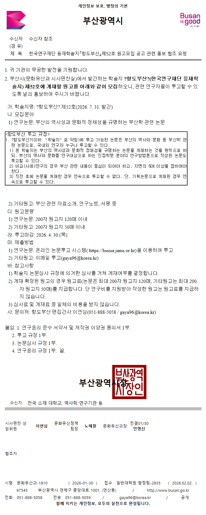 [본문] 한국연구재단 등재학술지『항도부산』제52호 원고모집 공고 관련 홍보 협조 요청.pdf