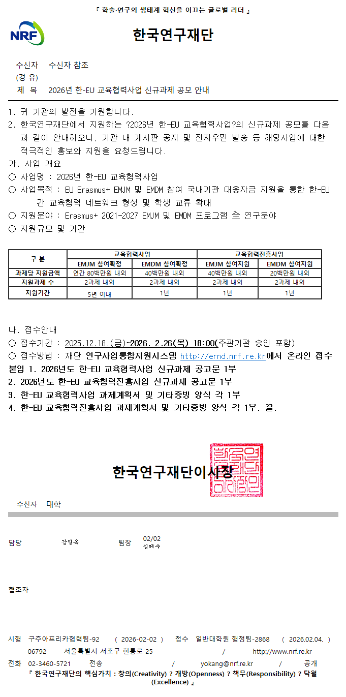 2026년 한-EU 교육협력사업 신규과제 공모 안내